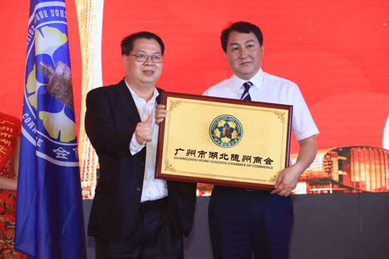 广州市人民政府协作办区域合作处林俊副处长给广州市湖北随州商会第一届会长徐长斌先生授会牌、会旗 。