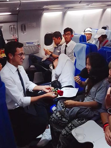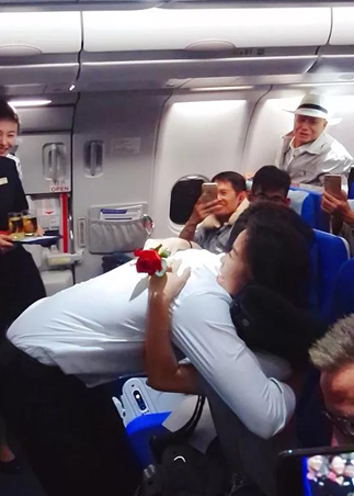 毫无准备的他在乘务组的帮助下鼓足勇气手拿玫瑰,在旅客的掌声中缓缓走向他心仪的女生。单膝下跪,真诚地献上了玫瑰,女生在惊喜之余脸上洋溢着幸福而又娇羞的笑容。随后及时乘务员送上了啤酒,男孩儿羞红了脸,但在乘务组姑娘和旅客的鼓励下拥抱了她,女生也很幸福地欣然接受了这个温暖的拥抱。