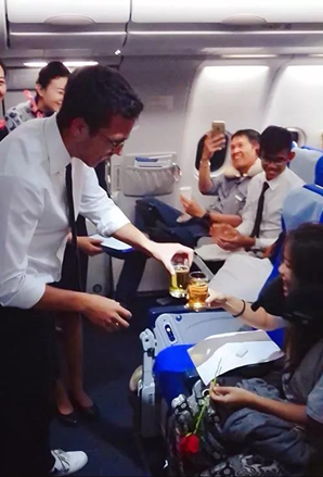 乘务组经商量决定先拟定好一篇广播词、给旅客做好解释,让客舱的旅客一起为他加油,为他祝福,同时也为他准备了玫瑰花和啤酒。