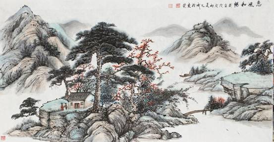 细读曾凡成的作品,其山水画经历两个阶段的画风揉和。首先,凡成是湖湘子弟,他的山水画作,有典型的湖湘画风传统,作品既有雪峰山脉之绵延奇绝,又有湘西南溪泉之神密清亮。他擅长以湖湘崀山特有的丹霞地貌写生入画,以折带皴、荷叶皴,大小斧劈的运用和对笔势的强调,在古典山水画氛围中营构出山水画现代审美节奏。从对自然造化的精心体察,到注重“留白”和“墨块”技法的实践运用,丰富了山水画作创的传统古法,又平中求奇富有表现力,追求在平常的景色中画出自然、历史和生命的统一。