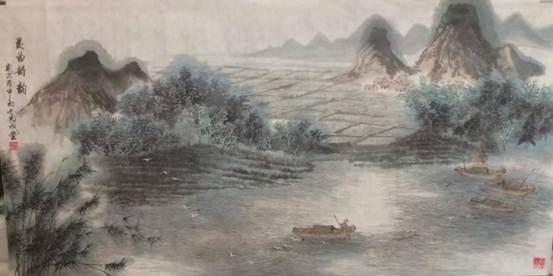 反映在创作上,曾凡成有意识地把湖湘山水文化溶于岭南水乡文化之中,在他的笔下,蕉林和荔海尽入眼底,莞味十足,但传统的岭南笔墨注入了来自湖湘山水蕴出的新的骨气,画面显得柔和但不失阳刚,融合但不突兀,大胆而新奇,给沉寂的画坛带来一股清新之气。所以他笔下之岭南蕉地,幽柔恬淡,有清静之气。他创作的“芭蕉经雨翠,江水泊舟幽”,既有湖湘山貌的视觉冲击力,又有岭南莞邑水乡蕉霞荔海之柔美,成为展现岭南莞邑大美之真实写照。