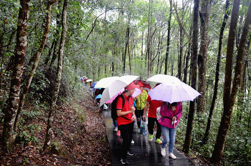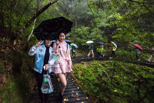15日清晨,一支身着红色T恤浩浩荡荡的队伍走在国家4A级风景区---阳明山国家森林公园内。一走进阳明山,便感受到公园里浓郁的生态意境,清新的空气沁人心脾,烟雨朦胧中游沟谷更是别有一番滋味。