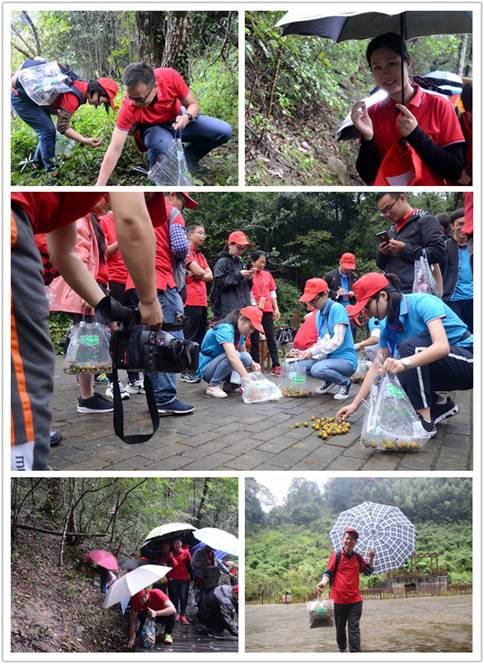 转过阳明湖,途经一片野生南酸枣林,大家便兴奋的开始期待已久的捡南酸枣比赛了。南酸枣树高大挺拔,生长在茂密的丛林和山坡上,大家深入山间密林中低头细致地寻觅掉落在树枝落叶间的南酸枣,每捡到一颗都兴奋不已。南酸枣只能靠其成熟自然掉落后人工捡拾,经过一夜的风吹雨打,不少游客收获颇丰,当然也有人颗粒无收。捡完南酸枣后,大家无不感叹着南酸枣的来之不易,对这个山间的野生果子增添更多的认识。