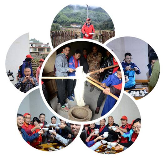 参观完油茶林基地我们来到齐云山脚---上十八垒,吃完农家饭,天空下起了小雨,我们决定就地扎营明日再登齐云山。在没有网络,四周群山围绕的山里,大家体验着农家老表的生活。有的三两打牌、有的接上音响尽情K歌、有的结伴深入山间小路畅游,还有不少人参与村民最原始打糍粑行动中······