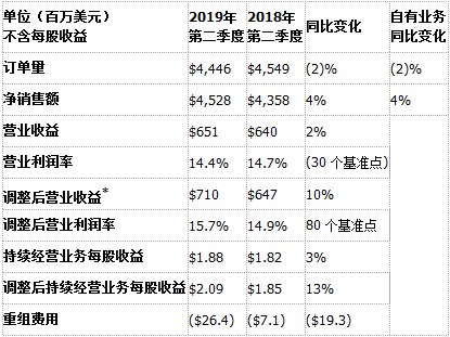2019年调整后营运收益指美国通用会计准则营运收益扣除重组费用,PFS并购相关交易成本,PFS库存增加和积压摊销成本以及工业技术业务拆分的相关成本。2018年调整后营运收益指美国通用会计准则营运收益扣除重组费用。详情请参见英文新闻稿附表3、4中美国通用会计准则依照非美国通用会计准则做出的调整。