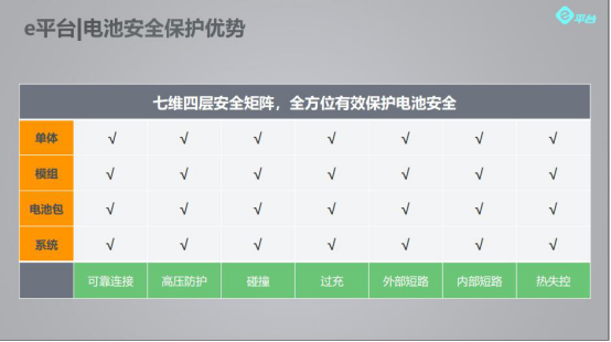 针对电池安全难题,比亚迪首先做的是将电池层层分级。原来电动汽车电池并非我们普遍认为的只是一块电池,其实际分为电芯、电池模组、电池包以及电池系统四个层次。为了保障电池安全的万无一失,比亚迪的方法是层层设防。每一层又分为“可靠链接、过充、内外短路、热安全”等七项措施,这样就形成了4X7的电池安全防护体系。
