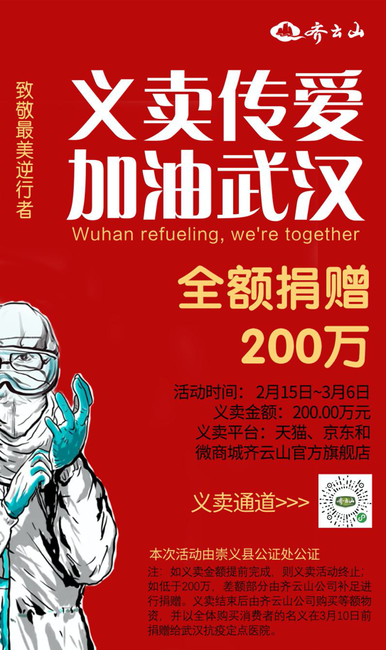 齐云山天猫官方旗舰店、京东旗舰店、微商城齐云山食品旗舰店同步开启线上义卖,目标义卖捐赠金额200万元。如提前完成义卖金额,则义卖活动终止;如低于200万,差额部分由齐云山公司补足进行捐赠。义卖结束后,由齐云山公司购买等额物资,并以全体购买消费者的名义在3月10日前捐赠给武汉抗疫定点医院。本次义卖活动由崇义县公证处公证。