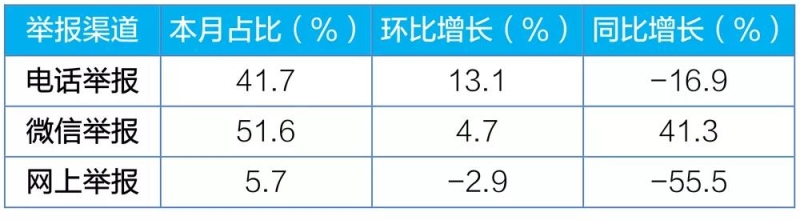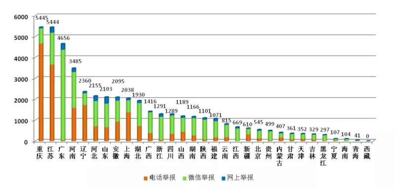 从各地区不同渠道举报数量看,重庆、江苏、广东等地举报总量居前,重庆、江苏、辽宁等地电话举报占比较高,广东、浙江、江西等地微信举报占比较高。