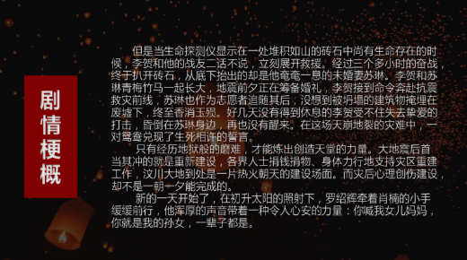 影片讲述灾难来临生与死的考验,人与人之间的感人故事,这场灾难无数人见证着,每一个感动的瞬间,都像一股暖流,流淌在人们心中,亚珠影视以此片呈现给大众,从影片中感受到地震无情,人间有爱的汶川精神。