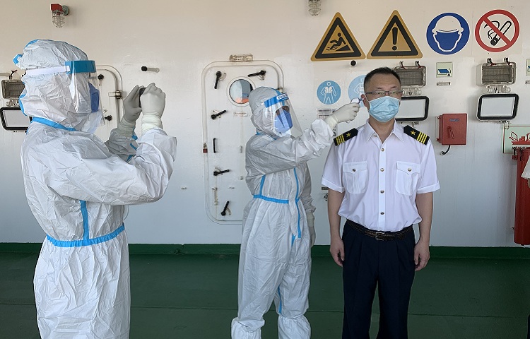 图为:钦州港海关疫情防控突击队正在对“中远太仓”轮进行登临检疫。甘树祥/摄
