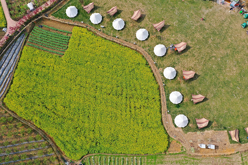 3月17日拍摄的贵州省安顺市平坝区小河湾村附近的油菜花地(无人机照片)。 新华社记者 刘续 摄