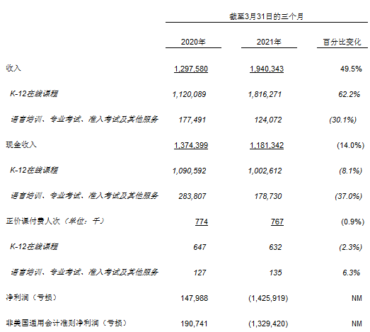 - K-12在线课程的现金收入为10.026亿元人民币,去年同期为10.906亿元人民币。