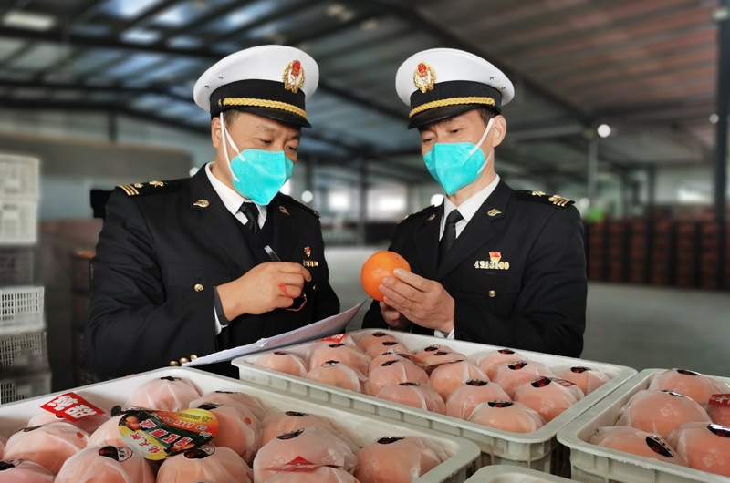 图为:关员对出口脐橙进行查验监管 李渊/摄