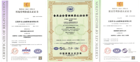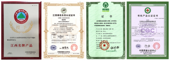 作为农业产业化国家重点龙头企业的齐云山,出品的“齐云山高纯山茶油”已通过“有机食品”、“绿色食品”、“江西绿色生态”和“赣南茶油”国家地理标志保护产品等权威认证,并先后荣获“江西名牌产品”、“中国茶油十大推荐品牌”、“2021江西农产品企业产品百强品牌”、“赣鄱正品”等殊荣,这充分印证了“中国好粮油”齐云山山茶油的硬核实力。