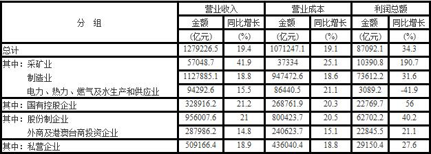 2021年,规模以上工业企业实现营业收入127.92万亿元,比上年增长19.4%;发生营业成本107.12万亿元,增长19.1%;营业收入利润率为6.81%,比上年提高0.76个百分点。