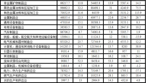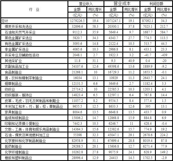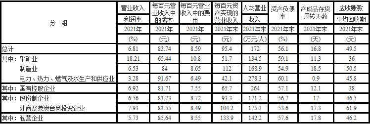 2021年,在41个工业大类行业中,32个行业利润总额比上年增长,8个行业下降,1个行业由盈转亏。主要行业利润情况如下:石油和天然气开采业利润总额比上年增长5.85倍,石油、煤炭及其他燃料加工业增长2.24倍,煤炭开采和洗选业增长2.13倍,有色金属冶炼和压延加工业增长1.16倍,化学原料和化学制品制造业增长87.8%,黑色金属冶炼和压延加工业增长75.5%,计算机、通信和其他电子设备制造业增长38.9%,非金属矿物制品业增长14.3%,电气机械和器材制造业增长12.2%,专用设备制造业增长10.2%,通用设备制造业增长8.3%,纺织业增长4.1%,汽车制造业增长1.9%,农副食品加工业下降9.2%,电力、热力生产和供应业下降57.1%。