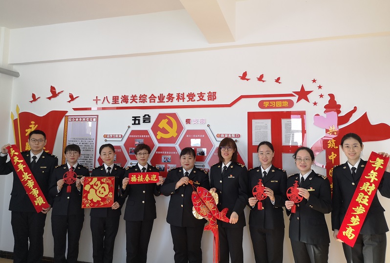 图为:满洲里十八里海关综合业务科开展送春联活动