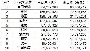 2、2021年锂离子蓄电池出口前十大目的地(按出口额排序)