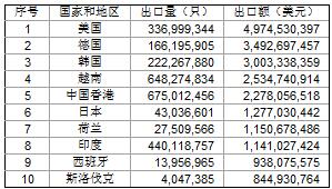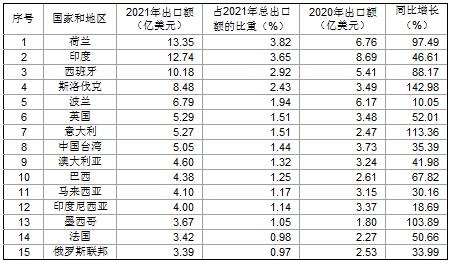 3、韩国,2021年出口韩国金额为31.46亿美元,占中国总出口额9.01%,2020年出口韩国金额为15.41亿美元,同比上涨了104.15%。