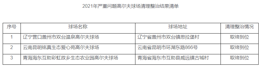 2021年,国家11部门指导各地严格落实高尔夫球场清理整治“两个责任”,扎实开展实地核查、专项核查等,严厉查处违法违规球场,持续巩固球场清理整治成果。在2021年清理整治“回头看”中,共发现辽宁营口盖州市双台温泉、云南昆明铭真生态爱心苑、青海海东互助彩虹故乡生态农业园等3个严重问题球场。目前,地方政府已对上述球场进行了坚决取缔,并严肃追究了相关单位和人员的责任。
