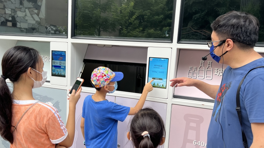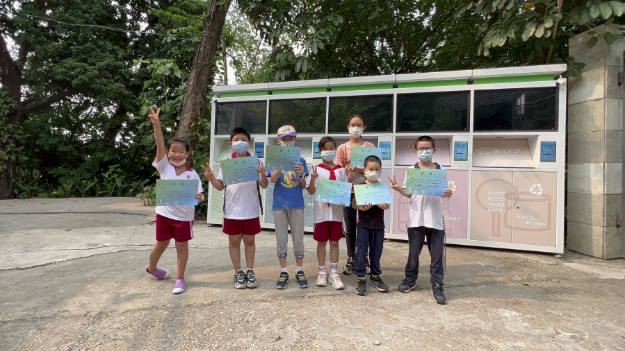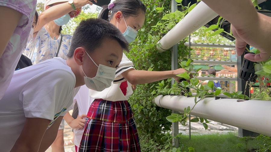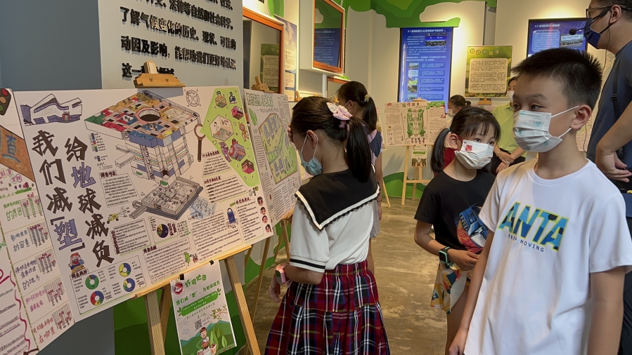 科技成果展中,以图文并茂的展板和产品互动体验的方式,呈现太阳能发电与蓄能、中水回用处理、可回收物智能化分类回收、高科技低碳农业等低碳减排科技,让孩子们直观体会“科技创新,助力减碳”。