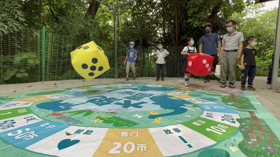 在园区另外一边,一张巨大的棋盘在地面铺开,孩子们在棋盘上兴高采烈地试玩名为《大象要回家》的桌游,其研发灵感来自2020-2021年间引发全国人民强烈关注的云南大象迁徙事件,寓生态文明教育于亲子之乐,家长们对游戏赞不绝口。