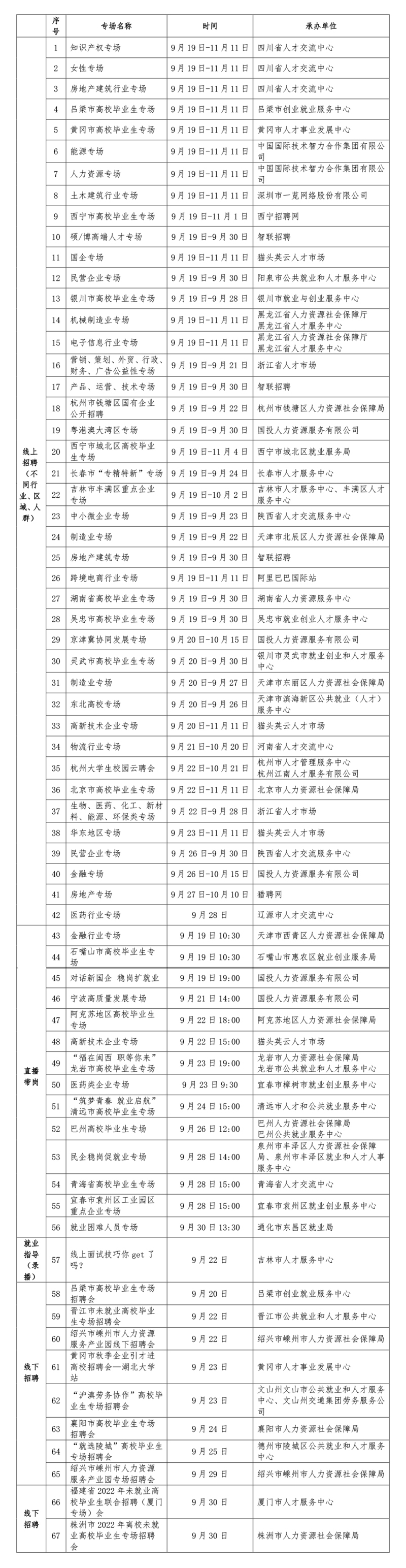 据人社部网站消息,人力资源社会保障部2022年大中城市联合招聘高校毕业生秋季专场活动近期将陆续推出第二批共67场特色服务活动。其中,线上活动57场,包括能源、土木建筑、机械制造、跨境电商、粤港澳大湾区等线上专场招聘会42场,直播带岗14场,就业指导录播课1场;线下专场招聘会10场。