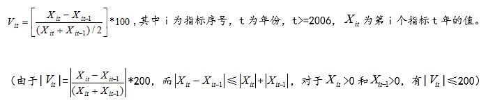 通常指标的增速或发展速度是以基期年份指标值作为基准进行比较的。在某一指标体系中,如果按照通常方法计算各指标的增速后进行加权平均,由于可能存在某些指标增速过高(或过低)的情况,这样就会造成指标增速之间不可比(即增速过高或过低的一些指标的作用掩盖了其他指标的作用),从而造成整个指标体系失真的现象。因此,必须采用对指标体系中各指标增速的范围进行控制的方法。一种较好的方法是将指标增速的基准值设定为该指标的两年平均值,这样计算出来的各指标增速的范围可以控制在[-200,200]的区间内。