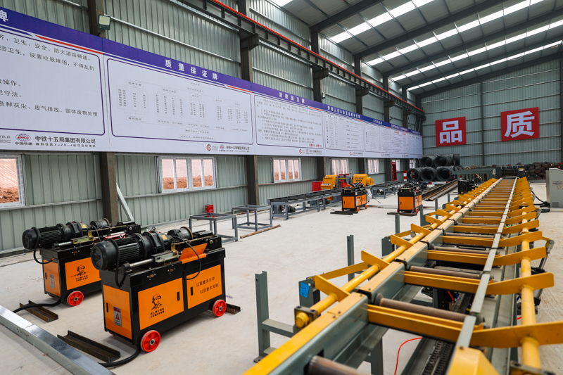襄荆铁路XJZQ-4标2号钢筋加工场位于主线DK116+000左侧200米,占地面积8.5亩,规划有原材存放区、加工区、半成品存放区、成品存放区、废料堆放区等区域,主要负责供应楚垭隧道、吴冲特大桥、刘家垭大桥、沙港河水库特大桥、荆襄左(右)线跨G347国道特大桥、襄荆左(右)线周家坡特大桥等工程的钢筋成品、半成品的制作。为提高钢筋加工效率和质量,实现“机械化换人、自动化减人、智能化无人”目标,钢筋场内设置了两条自动化程度较高的配套生产线,配有数控钢筋笼滚焊机、数控立式双头钢筋弯曲中心、全自动滚丝机、数控剪切生产线、数控钢筋调直切断机、数控弯箍机、数控带锯床、电动桁吊等多种先进智能机械设备。