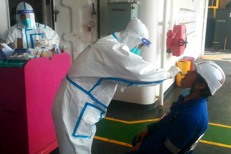 图为:李跃琦对入境船员进行核酸采样 彭建利/摄