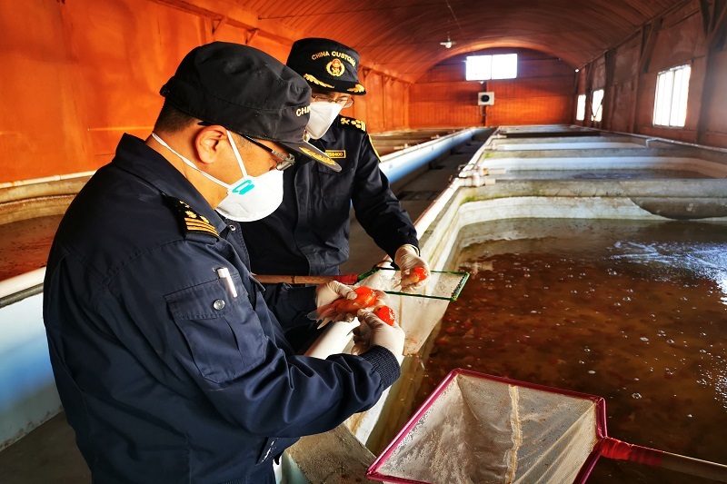 图为:关员在出口韩国活鱼企业进行现场监管 天津海关/摄
