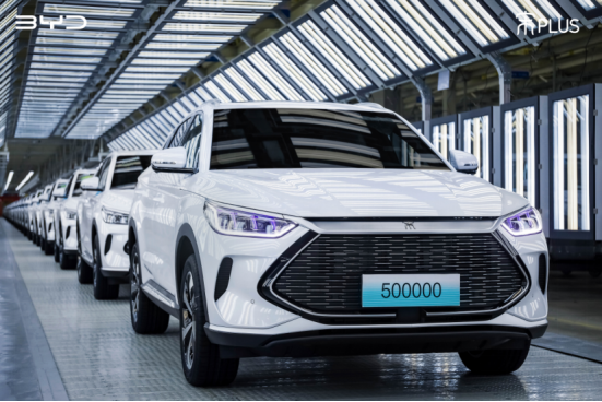 近日,比亚迪汽车西安工厂内,带有第50万辆标志的宋PLUS DM-i缓缓驶出生产线。