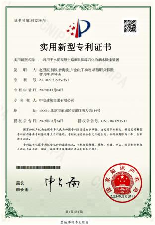 导言:日前,中交建筑宁波项目公司申报的《一种用于水泥混凝土路面共振碎石化的洒水除尘装置》实用新型专利获得国家知识产权局授权。