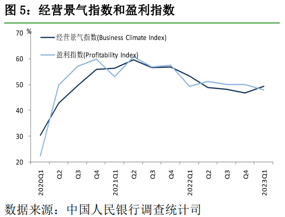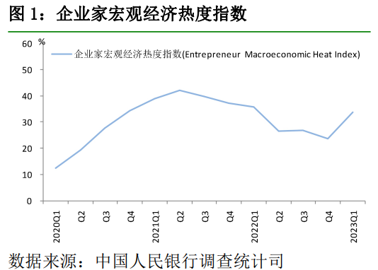 中国人民银行3日发布的调查报告显示:2023年第一季度,我国企业家宏观经济热度指数为33.8%,比上季上升10.3个百分点,比上年同期下降1.9个百分点。其中,33.9%的企业家认为宏观经济 “偏冷”,64.6%认为“正常”,1.5%认为“偏热”。