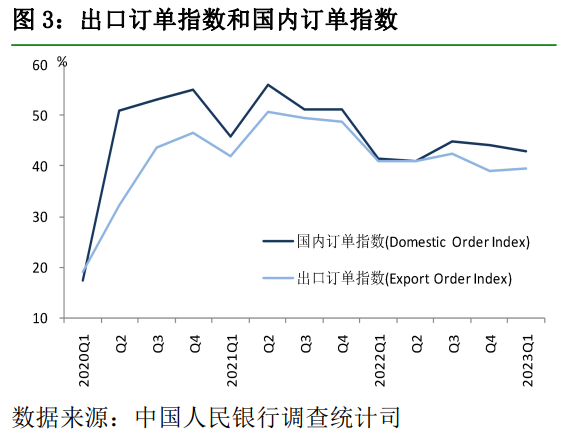 一季度,出口订单指数为 39.5%,比上季上升 0.5 个百分点,比上年同期下降 1.5 个百分点。 其中,13.7%的企业家认为本季出口订单比 上季“增加”,51.6%认为“持平”,34.8%认 为“减少”。