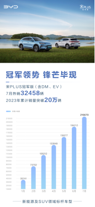 近日,比亚迪官方公布了7月份的销量数据,比亚迪7月共销售新能源汽车262161辆,其中乘用车销量261105辆,同比增长61%,再创月度销量新高。值得一提的是,不久前于6月19日上市的宋PLUS冠军版车型表现优异,7月共销售32458辆,相比6月再度攀升,其中DM-i车型售24050辆,EV车型售8408辆,展现了宋PLUS冠军版车系的冠军实力。今年1-7月,宋PLUS车系累计销量已突破20万,其将持续推进汽车行业新能源进程,为中国自主品牌塑造行业标杆形象。