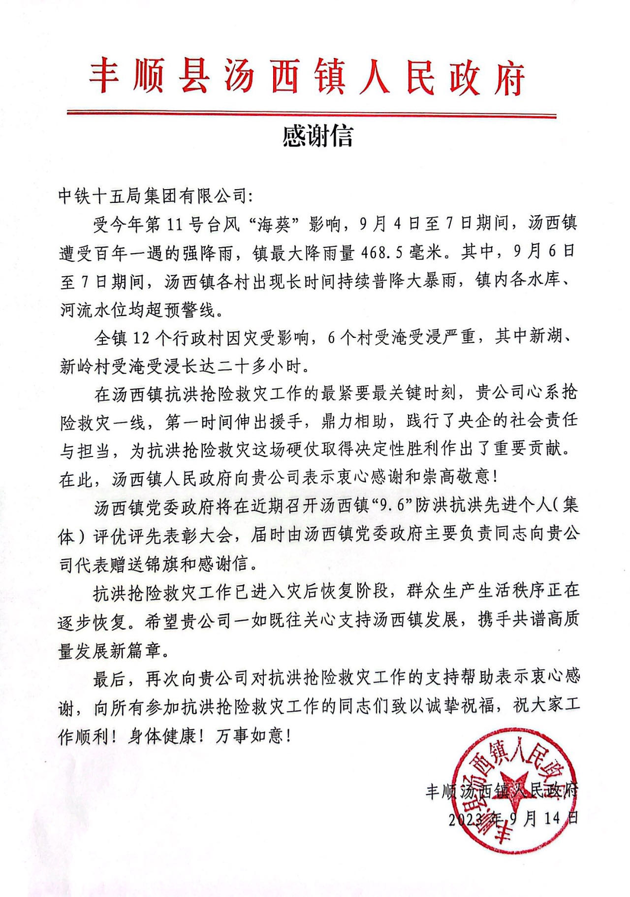 导言:9月14日,广东省梅州市丰顺县汤西镇人民政府给中铁十五局集团有限公司发送感谢信,对中铁十五局汕梅高速改扩建项目部积极参与当地抗洪抢险救灾表示感谢。