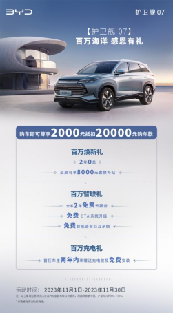 护卫舰07此次特别推出限时惊喜购车福利,用户自2023年11月1日0:00起,至11月30日24:00前完成购车开票,即可享受2000元抵20000万现金购车款优惠,并可同时享受2年0息、至高可享8000元置换补贴。此外,消费者还可享受全系车型2年免费云服务、免费OTA系统升级和免费智能语音交互系统的使用权益。首任车主两年内享赠送充电桩以及免费安装的服务。