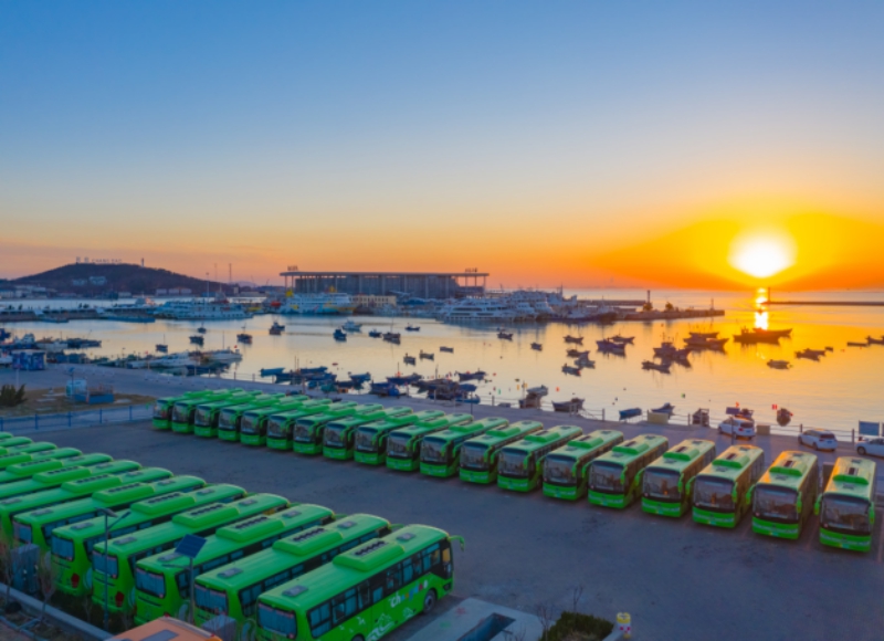 山东烟台长岛渔港码头附近,纯电动绿色公交车整齐排列。供电公司协助开展智能充电桩运维工作。