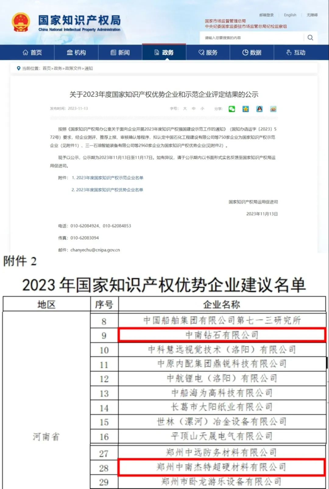 近日,国家知识产权局发布《关于2023年度国家知识产权优势企业和示范企业评定结果的公示》,豫西集团中南钻石有限公司及子公司郑州中南杰特超硬材料有限公司同时入选2023年度国家知识产权优势企业。