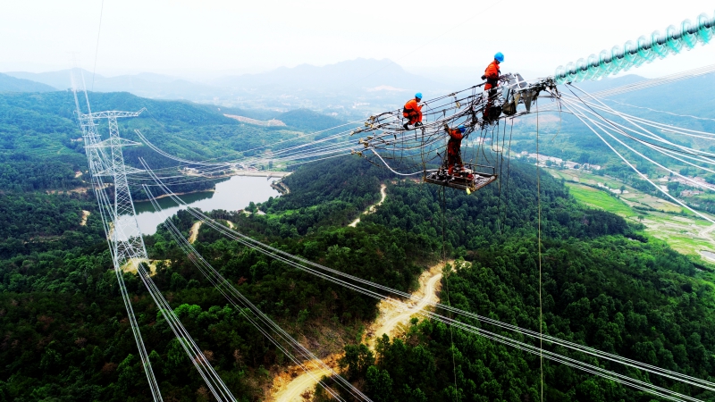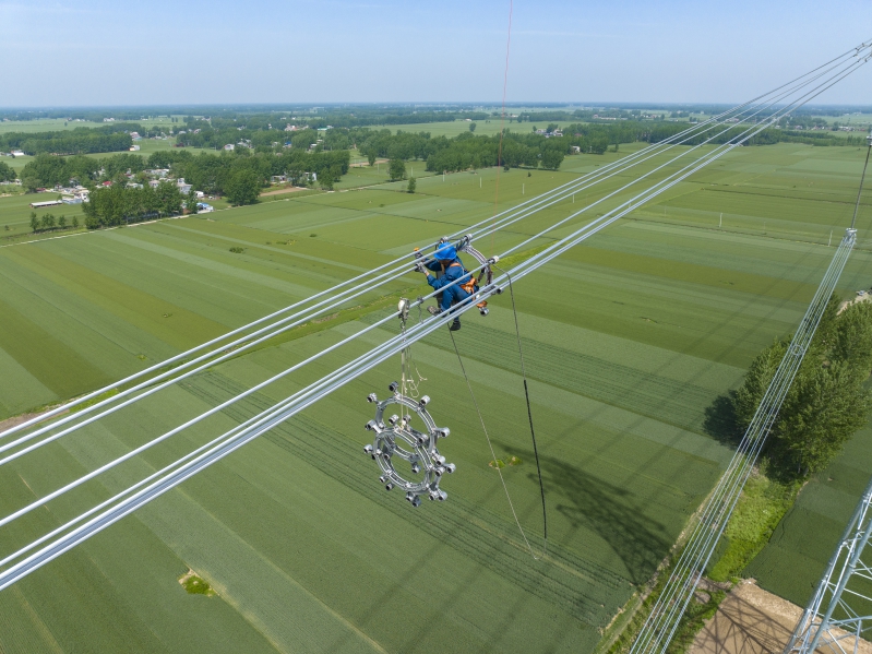 国网河南送变电公司员工在驻马店—武汉特高压工程建设现场安装导线间隔棒。