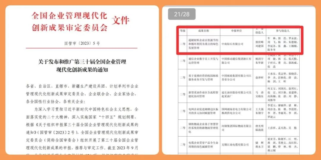 日前,全国企业管理现代化创新成果审定委员会印发管理创新成果获奖通知,豫西集团中南钻石申报的《超硬材料企业以资源节约和循环利用为重点的绿色发展管理》成果荣获第三十届全国企业管理现代化创新成果二等奖。