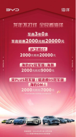驱逐舰05冠军版限时购车权益包含多重购车礼遇:用户自2024年2月1日起至2月29日24:00前完成购车开票,即可享受2000元抵扣7000元购车款(不包含120KM豪华型),同时可享“2年0息”、“2年免费云服务、2年免费车机流量”等多重好礼。