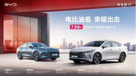 比亚迪驱逐舰05荣耀版凭借低至7.98万的起售价、越级的新能源出行体验,以及入门即高配的配置优势,荣耀再出击,实现“电比油低”,以强有力的市场竞争力,为年轻首购家庭用户带来无压力、高价值的出行体验。