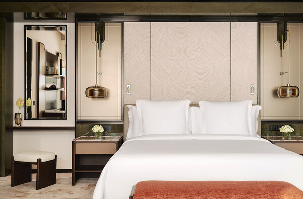Wimberly Interiors的设计理念体现了岭南文化的艺术精髓,将镬耳屋的形态作为岭南文化的符号载体,以现代设计语言重新诠释,贯之于迷你吧、屏风、梳妆台及浴室的细节表现中,如若广州城的剪影一般,写意中营造出独属于岭南的韵味。"广州是一座生生不息的城市,历史底蕴与现代活力在此交织。我们希望通过兼具隽永与未来感的设计,展现这座城市的独特魅力,将珠江的柔波、白云山的叠翠、城市天际线的律动转化为空间语言,打造真正具有广州韵味的沉浸式体验。" Wimberly Interiors执行董事Rachel Johnson表示。