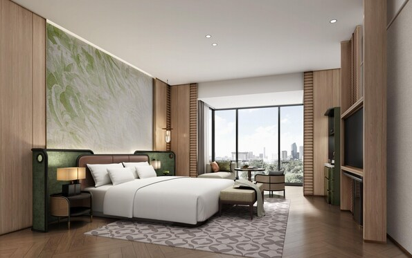 在酒店内策划沉香体验中心 • 文化展厅等具备在地文化特色的元素与体验;客房区加入岭南文化特色"镬耳墙"的手法,设置出更好的山水观景视角,体现岭南东方酒店一贯的东方清雅风格。