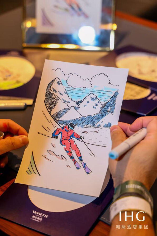 步入大堂一侧,宾客随即沉浸于「洲至奢选・插画时光」。源自洲至奢选全球不同酒店的九幅意义非凡的画面汇聚成一处精致的小画廊,正如品牌名称"洲至奢选(Vignette Collection)"中的"Vignette"一词,意为小插画、小故事,寓意每一段洲至奢选酒店的入住体验就像旅途中的一幅幅小插画,人生篇章中的一段段小故事。现场插画师邀请宾客共同执笔创作,为雪场英姿添彩,为难忘居停增色。一笔一画间,个性悄然流露,共鸣自然而生。