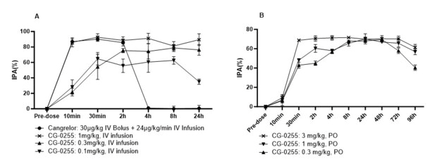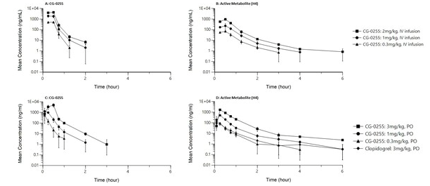 起效快,个体差异小: 动物实验(比格犬)显示,无论是口服还是静脉注射CG-0255,都能在10分钟内快速起效,并在30分钟内达到最强的抗血小板效果。由于代谢路径简单直接,避免了"氯吡格雷抵抗"问题,减少了不同患者间的效果差异和药物相互作用风险。