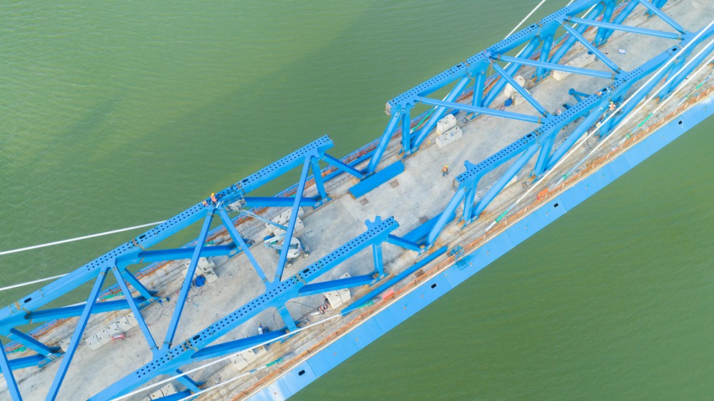 图为施工人员进行钢桁梁焊接作业。