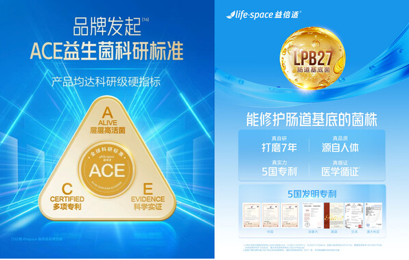 第一,lifespace益倍适自建全球微生态研究中心,汇聚了全球多位顶尖科学家、50多家科研机构及头部菌株供应商的科研力量,保障从菌株筛选到产品研发的每一步都有科学支撑。基于此,lifespace益倍适创立ACE益生菌科研标准:A指Alive,层层高活菌,严格把控关键链路中的高活菌数,多款产品达到活菌率一级;C指Certified,多项专利,坚持自主研发,构建专利矩阵,在菌株、配方和工艺等方面,获得多项专利成果。例如,lifespace益倍适今年广泛应用的自主研发专利菌——LPB27*肠道基底菌,便是其历时7年自主研发的成果,此菌株已获得国内外多项发明专利。E指Evidence,科学实证,核心菌株、重点产品均具备科学实证。